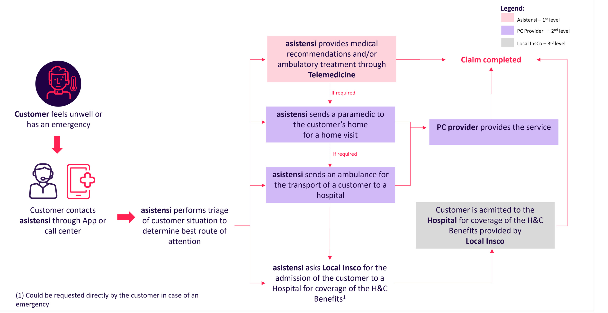 Another one in the destination market were Asistensi was the policyholder and covered only the hospitalization and surgery inpatient coverage. This policy was a group policy issued by a local carrier (always the #1 ranked player in the country) and the beneficiaries were the family members of the migrants. Primary care outpatient coverage was provided as a service since this is not an insurable risk in most jurisdictions.